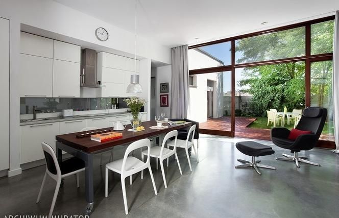 На 120 м 2 этого современного дома есть гостиная, соединенная с кухней, спальня, детская комната, гардеробная ванная комната, туалет и … мастерская вместо гаража. Здесь создаются картины и графика, которые можно увидеть в холле, гостиной и спальне. Хозяева ценят простоту и непосредственность, поэтому во всех комнатах был уложен пол из полированного бетона и в них установлена простая, функциональная мебель. Белые стены и большое остекление наполняют дом светом. Дизайн современного дома был разработан архитектурной студией Studio DNA на основе концепции Анны Клосиньской.