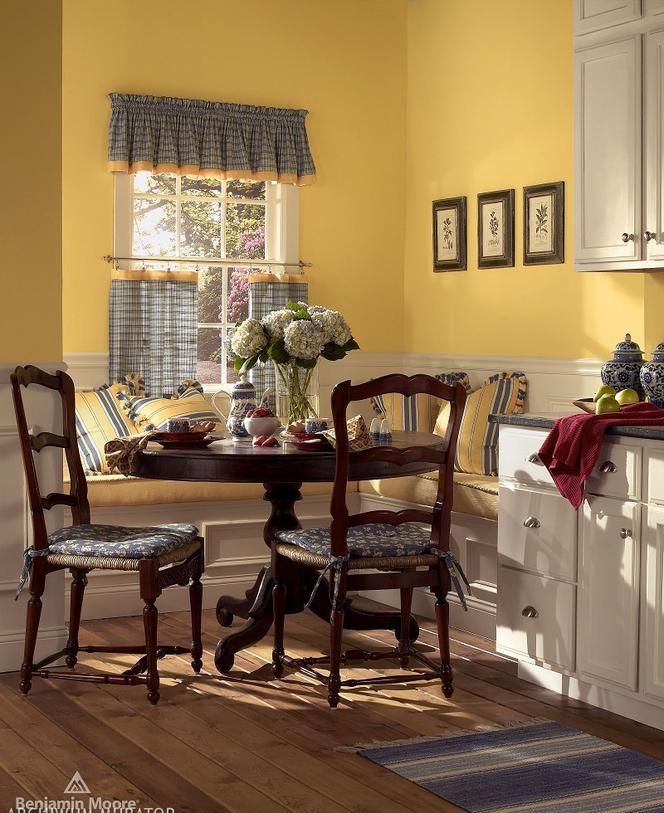 Желтый цвет обладает осветляющими свойствами, поэтому он отлично работает на кухне, где мало света, особенно на севере или востоке. На фото в кухонной расстановке использована классическая мебель и удобное сиденье у окна. Свежие цветы в вазе придают очарование кухне, круглому столу, ревности «бабушки» и удобным подушкам (фото: Бенджамин Мур).