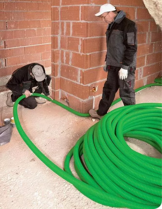 1. Система пластиковых воздуховодов PE-FLEX позволяет получить необходимый ход монтажа без использования фитингов. Провода сматываются с катушки по указанному в проекте маршруту