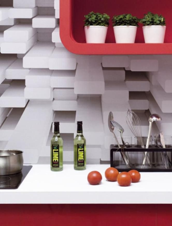 На трехмерных обоях, наклеенных на стену, кубики кирпичей располагаются в разных плоскостях. Кажется, они "убегают" из поля зрения. Эффект усиливается контрастом белой стены с малиново-красными полками и фасадами шкафа.