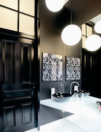 Черно-белая графика над стеклянной раковиной, а также лампы и кран из хромированной стали отражают свет и украшают интерьер. Благодаря им не кажется туго и темно.