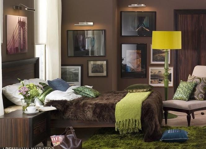 Уединенная спальня в натуральных тонах, но в интенсивной версии. Глубокие коричневые и ярко-зеленые цвета далеки от своих пастельных аналогов. Интерьер очень уютный, в том числе благодаря разнообразию используемых тканей.