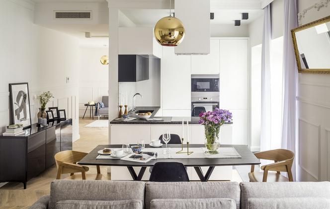 Подвесной потолок на разных уровнях разделяет пространство кухни, столовой, гостиной и коридора. Дизайн: Эвелина Немчик-Лоза, Джоанна Скшинярз, Лукаш Лоза / Noye Studio