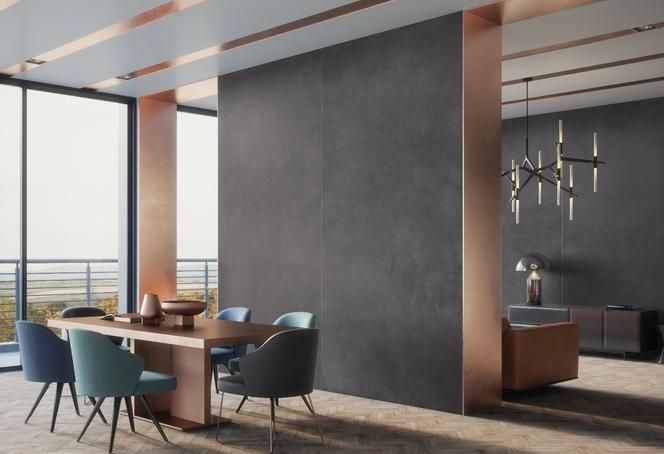 Производители плитки также следуют моде на бетонную внутреннюю отделку. Вы можете найти множество коллекций плиток с конкретным дизайном в различных стилях. Есть сырой бетон, необработанный, вытертый, залитый, сколотый, треснувший. Есть плитки, которые выглядят как бетонные плиты с крепежными отверстиями. По-прежнему популярны пластины, которые выглядят как старая латунь, ржавая сталь, потускневшая медь. Но металл также появляется в мерцающей форме в виде золотых или серебряных декоров. В моде тонкие металлические нити, словно нанизанные на выступы, выступающие из пластин.