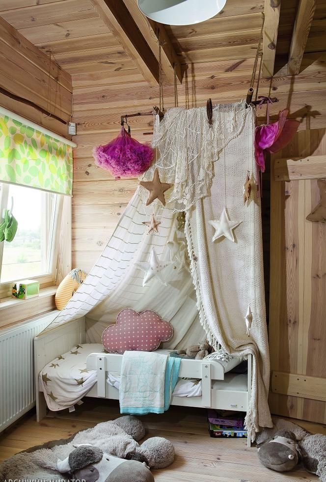 Вопреки видимости, синий не зарезервирован исключительно для комнаты мальчика. Этот цвет в комнате девочки приобретает мечтательную ноту, а сочетание его с розовыми акцентами оживляет композицию. Откуда ты знаешь, что хозяйка этой комнаты ходит с головой в облаках? Посмотрите на балдахин над кроватью … Кроме того, материалы, использованные при оформлении, легки как облако: тюль, пластик, бумага.
